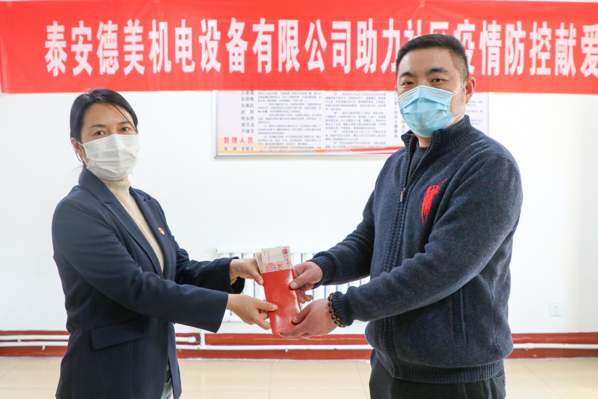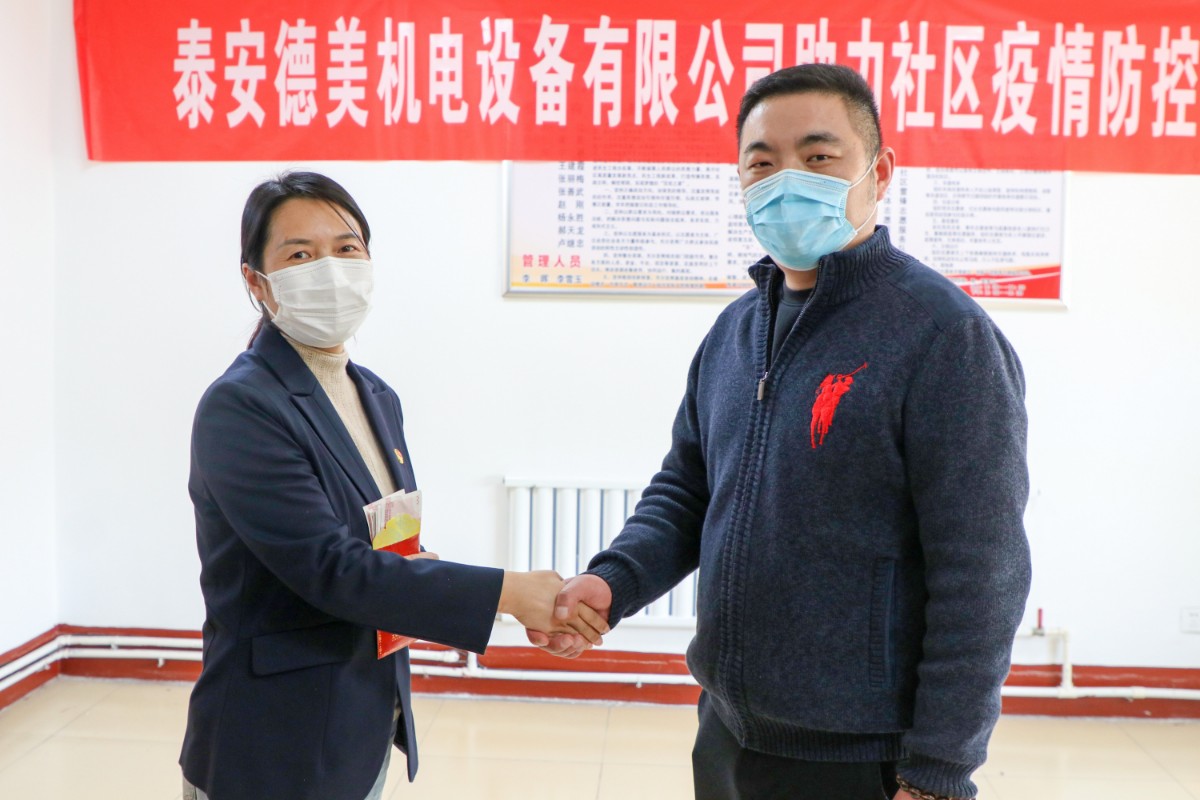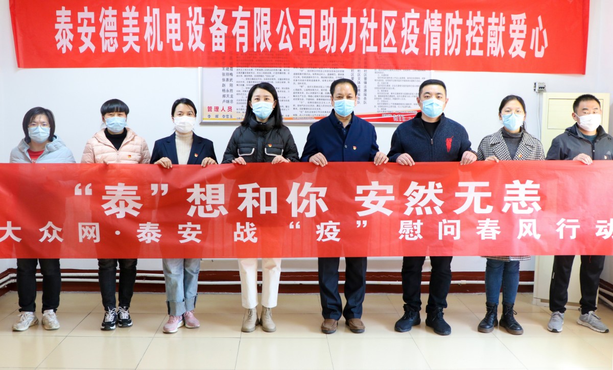 在疫情防控關鍵時期,泰安德美機電設備有限公司作為泰安國際商會副會長單位、泰山區(qū)政協(xié)委員獻出愛心,通過市貿促會、區(qū)貿促會牽線搭橋,為鐵路新村捐贈防疫物資,