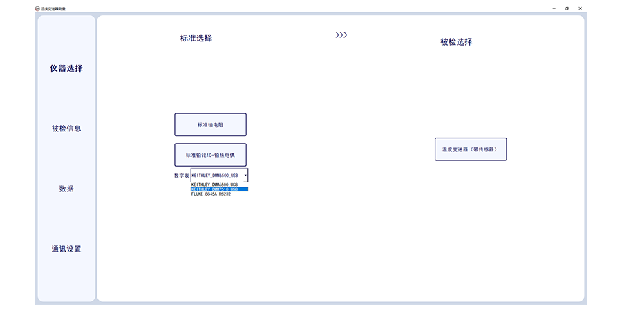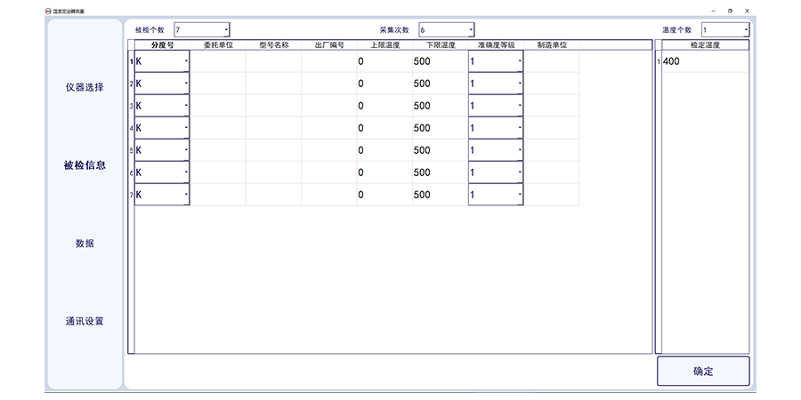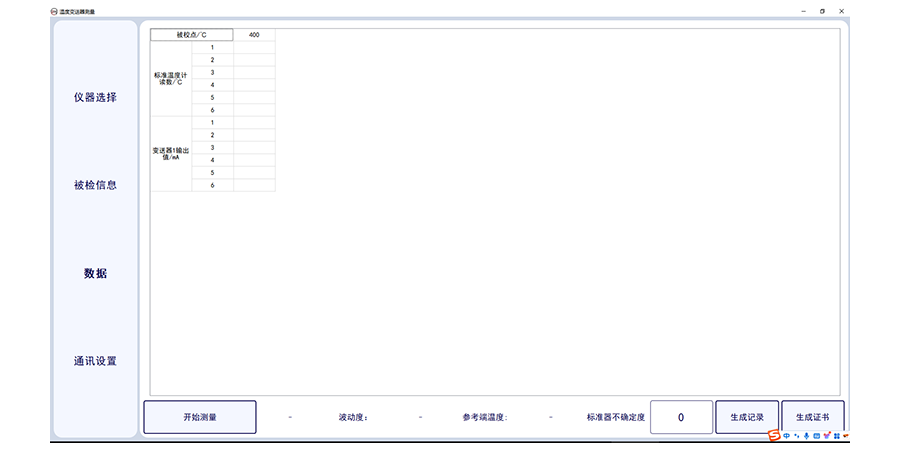 溫度變送器計(jì)量校準(zhǔn)上位機(jī)軟件,此軟件適合溫度變送器的輸出電流采集,軟件需要溫度變送器(帶傳感器)配套標(biāo)準(zhǔn)器、恒溫設(shè)備及相應(yīng)數(shù)字萬用表。軟件可選擇多個被檢傳感器,可設(shè)置采集次數(shù),及溫度個數(shù)及溫度點(diǎn)。軟件可輸入委托單位,型號名稱出廠編號及準(zhǔn)確度等級及制造單位。