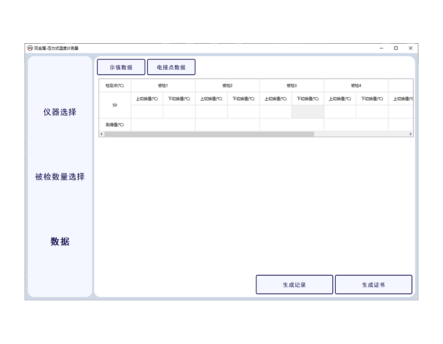雙金屬溫度計軟件為DY-01熱工系統(tǒng)的配套軟件,可通過讀取雙金屬溫度計計壓力式溫度計數據,記錄數據文件,并對數據文件進行分析提取及計算,并可按照相關規(guī)程、規(guī)范輸出溫濕度場巡檢記錄及測試報告、證書等。
