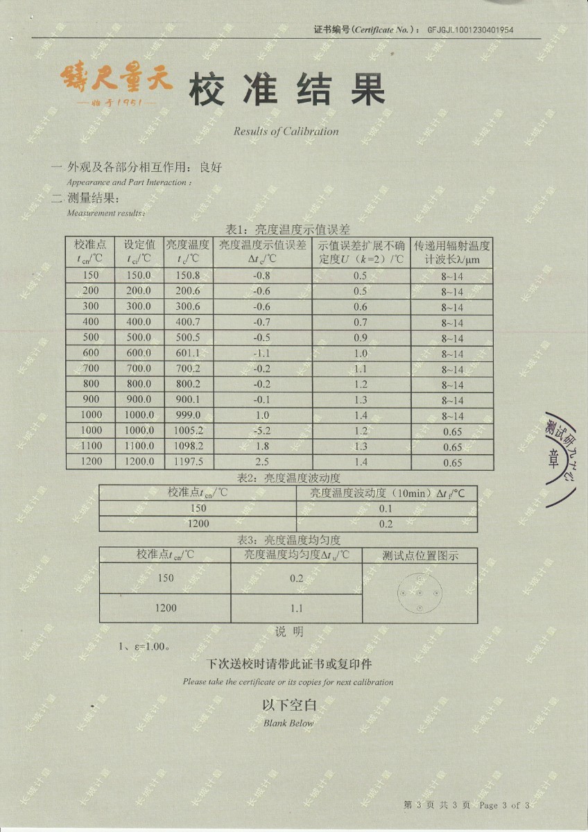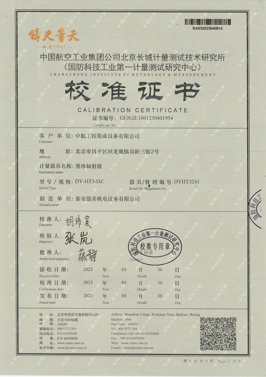 上一條:中航工程集成設(shè)備有限公司 黑體輻射源 校準(zhǔn)證書(shū) (1) | 下一條:超低溫面源黑體爐(-40-80℃)校準(zhǔn)證書(shū) |