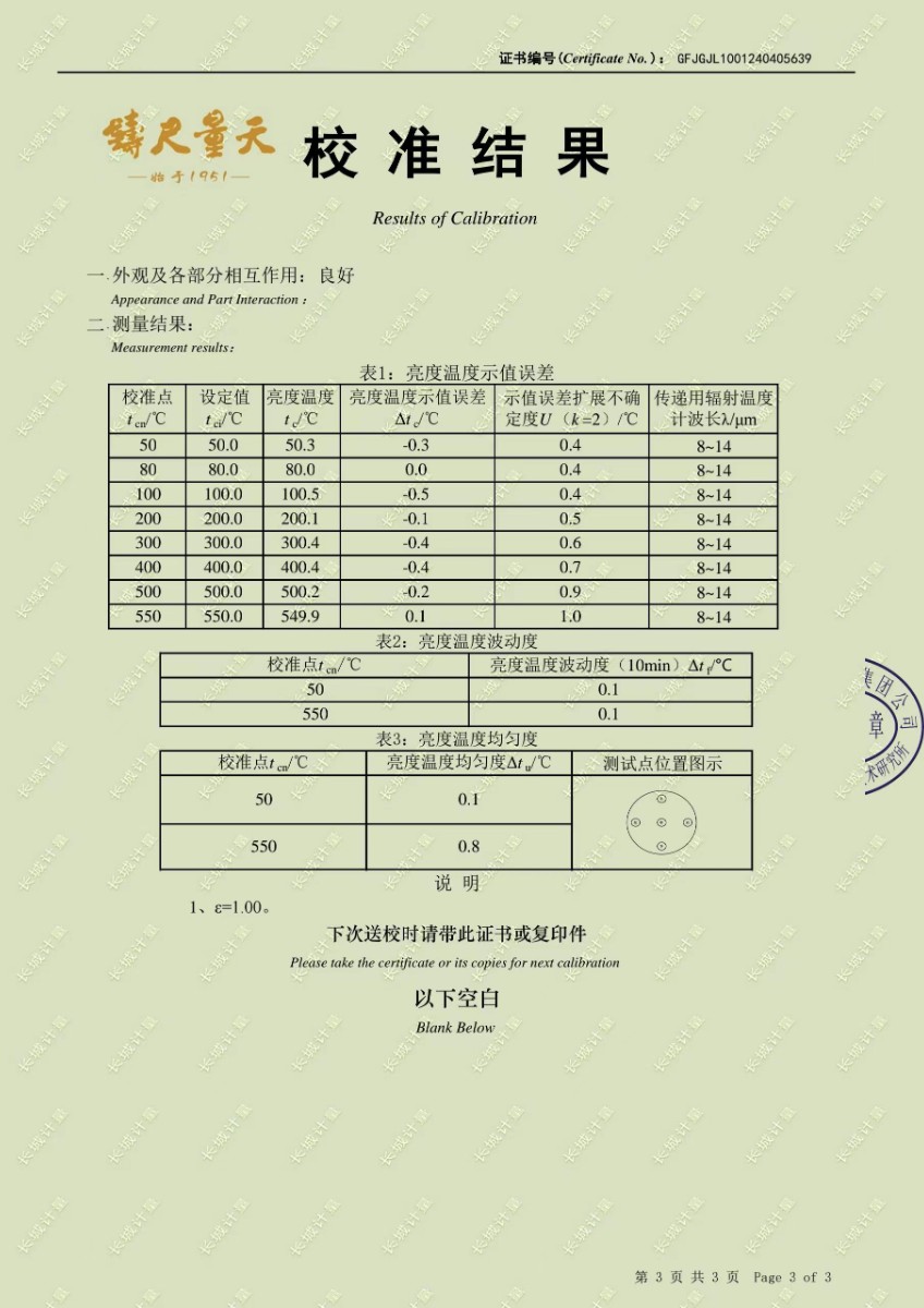 黑體爐校準(zhǔn)證書(shū) 2024-4-24 本文被閱讀 8400 次