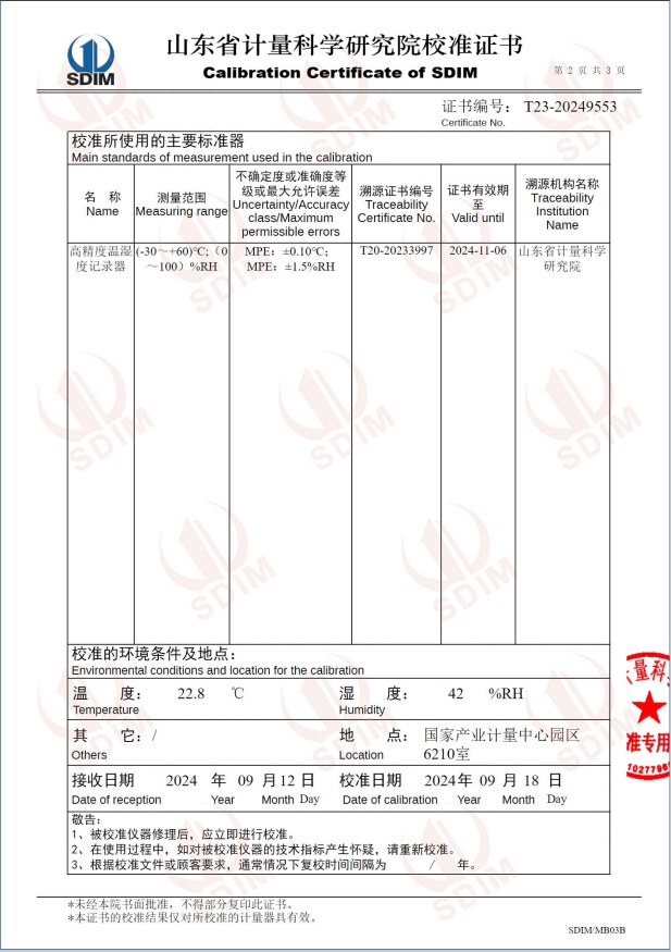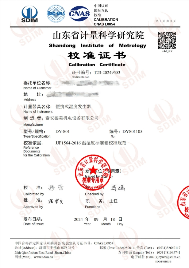 便攜式濕度發(fā)生器(5~50℃)校準證書 2024-9-20 本文被閱讀 6345 次