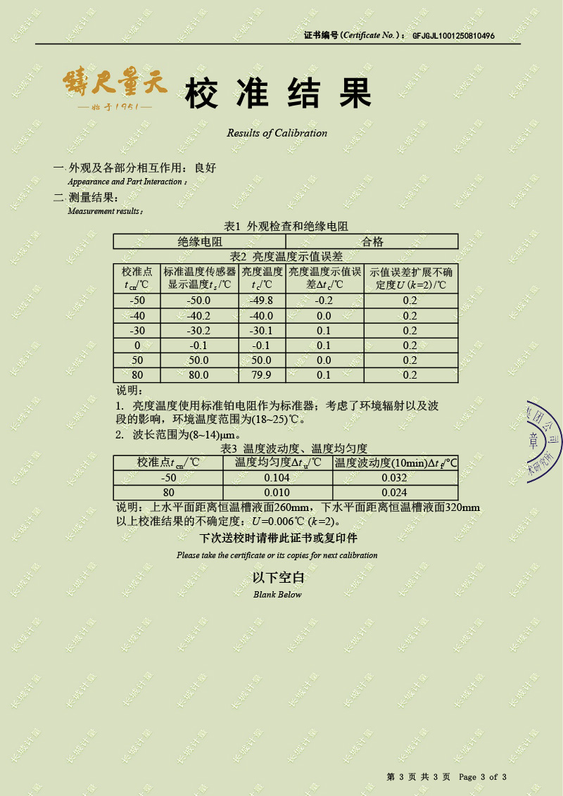 上一條:DY-HT1MF-200低溫雙面黑體爐/黑體輻射源(-10℃-80℃) | 下一條:超低溫面源黑體爐(-40-80℃)校準(zhǔn)證書 |