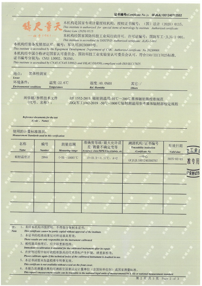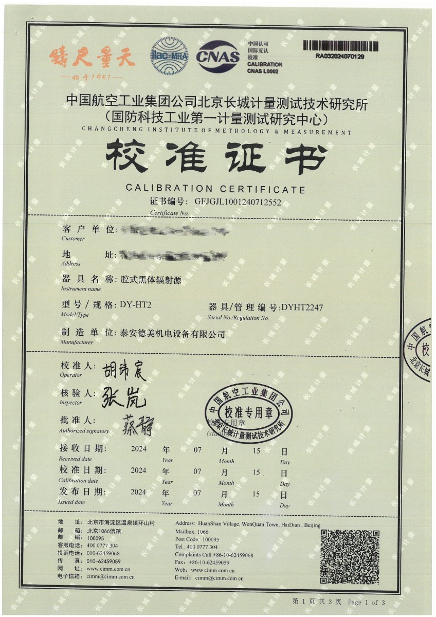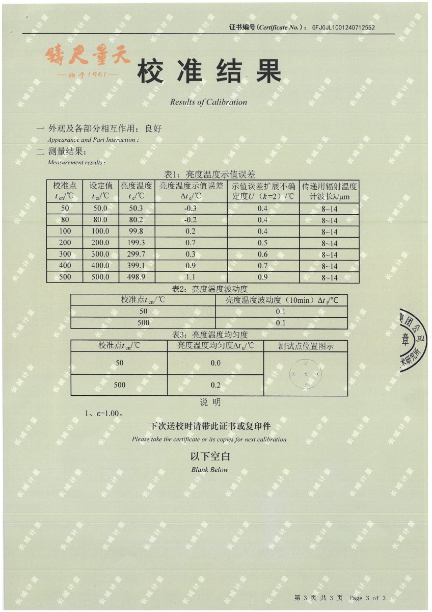 腔式黑體(50~500℃)校準證書 2024-7-29 本文被閱讀 7403 次