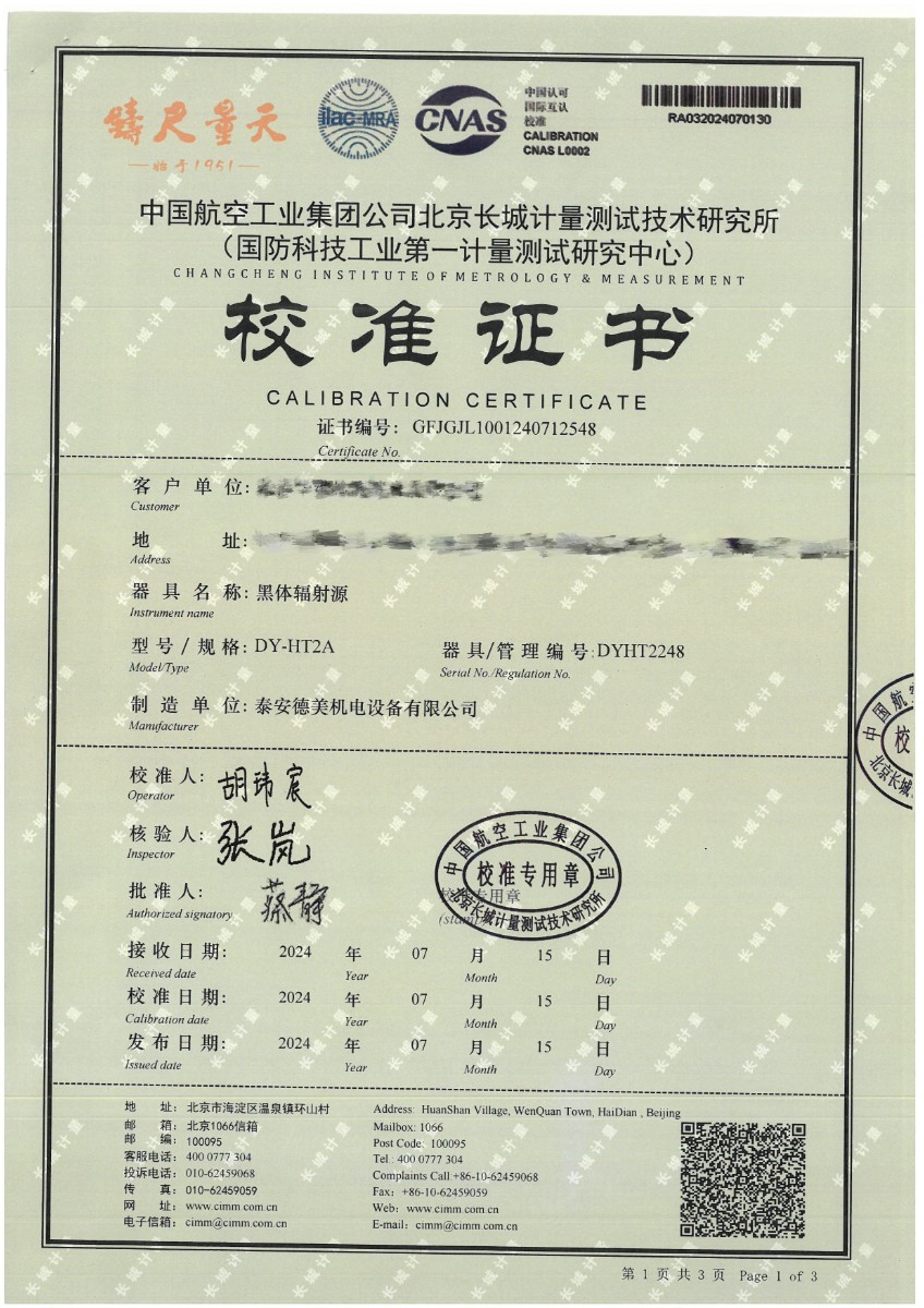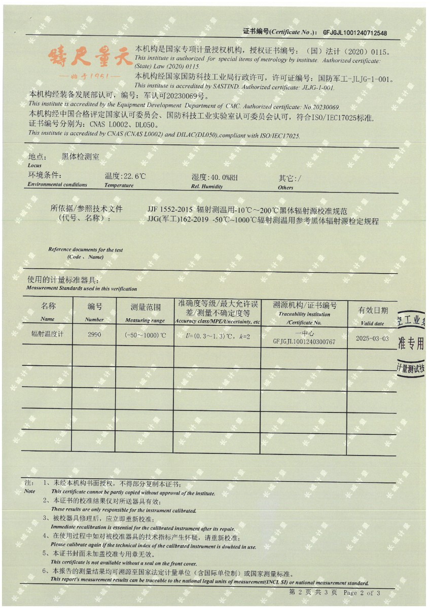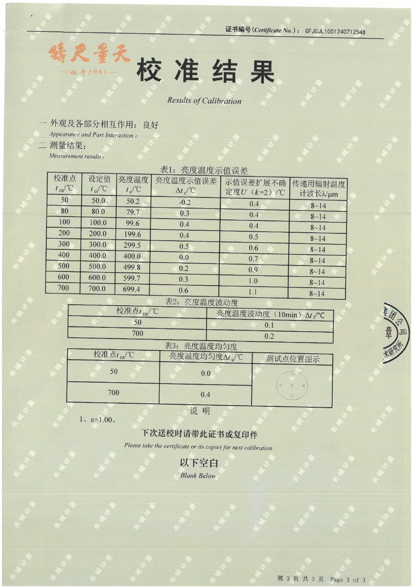 黑體(50~700℃)校準證書 2024-7-29 本文被閱讀 9216 次