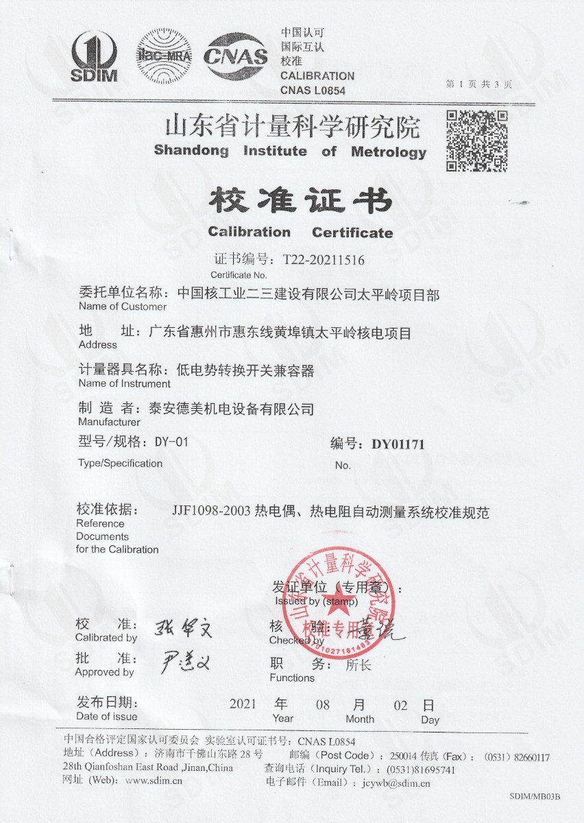 上一條:中國核工業(yè)二三建設(shè)有限公司太平嶺項目部水平尺專用校準(zhǔn)臺 | 下一條:超低溫面源黑體爐(-40-80℃)校準(zhǔn)證書 |