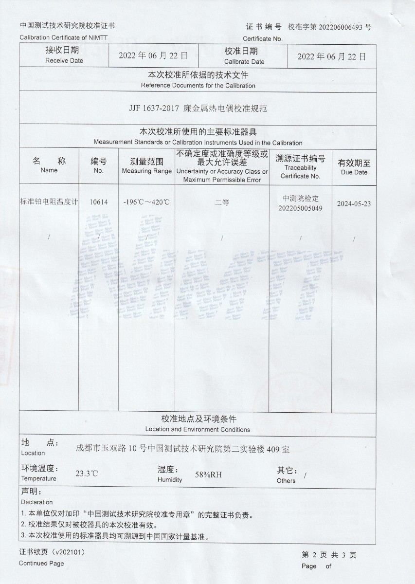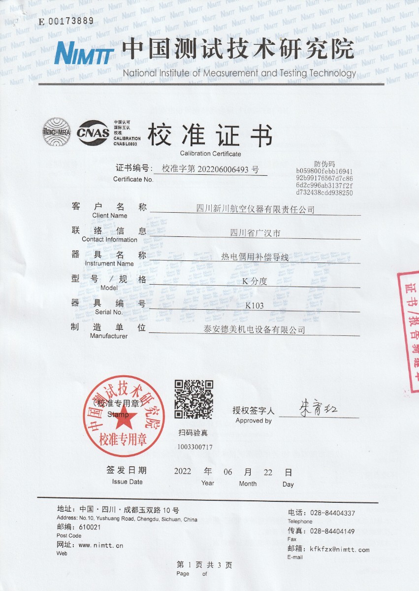 上一條:四川新川航空儀器有限責任公司-S分度補償導線下一條:超低溫面源黑體爐(-40-80℃)校準證書