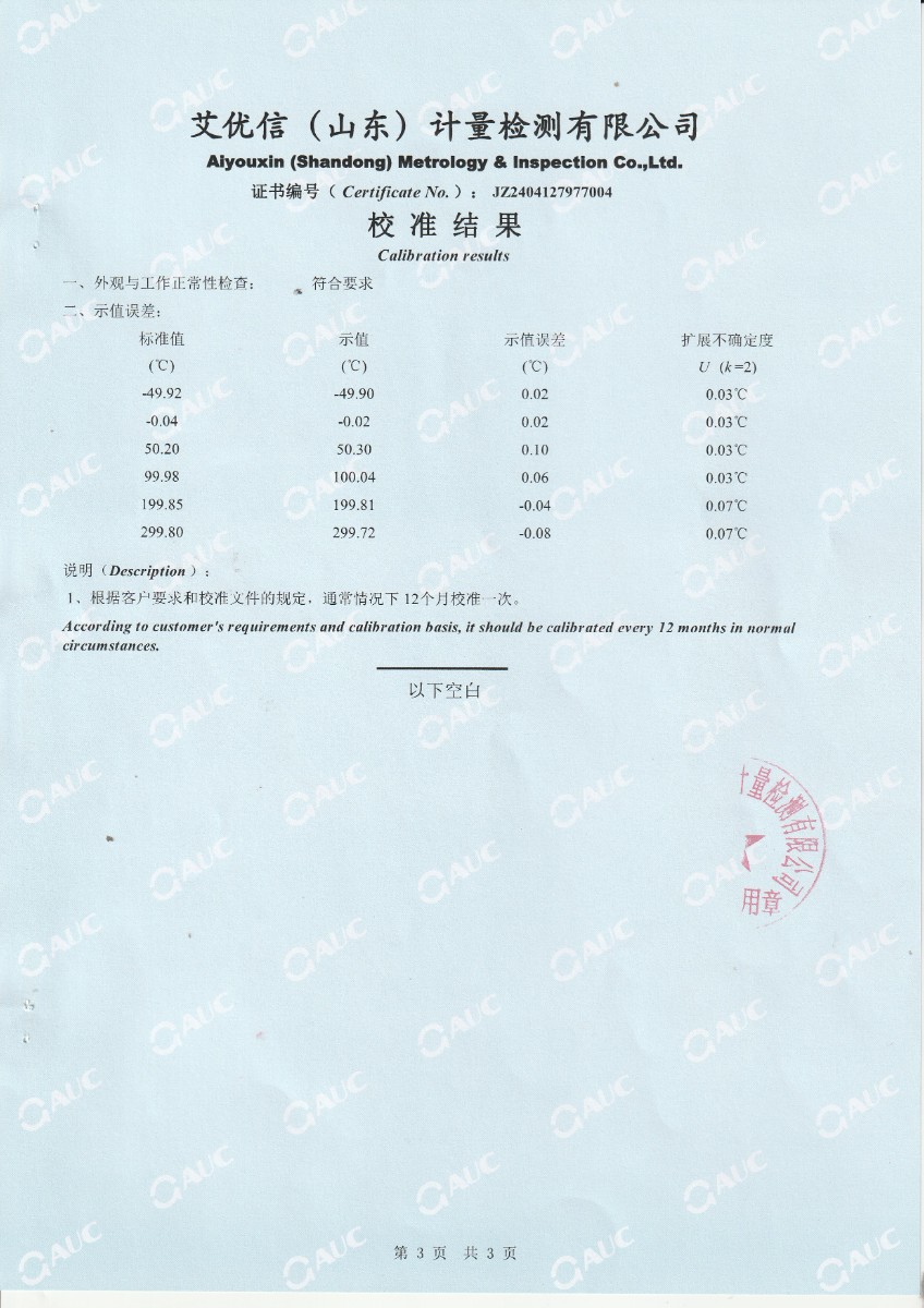 高精度數(shù)字溫度計校準證書