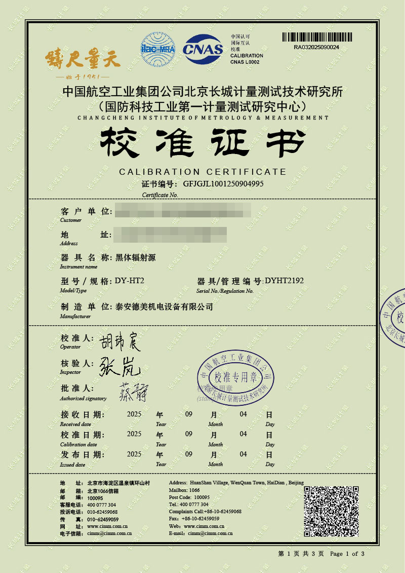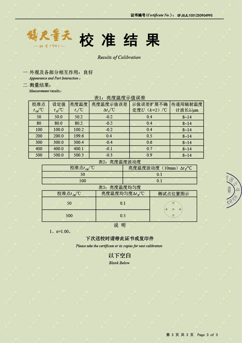 黑體輻射源(50-500℃)校準證書 2025-9-12 本文被閱讀 1024 次