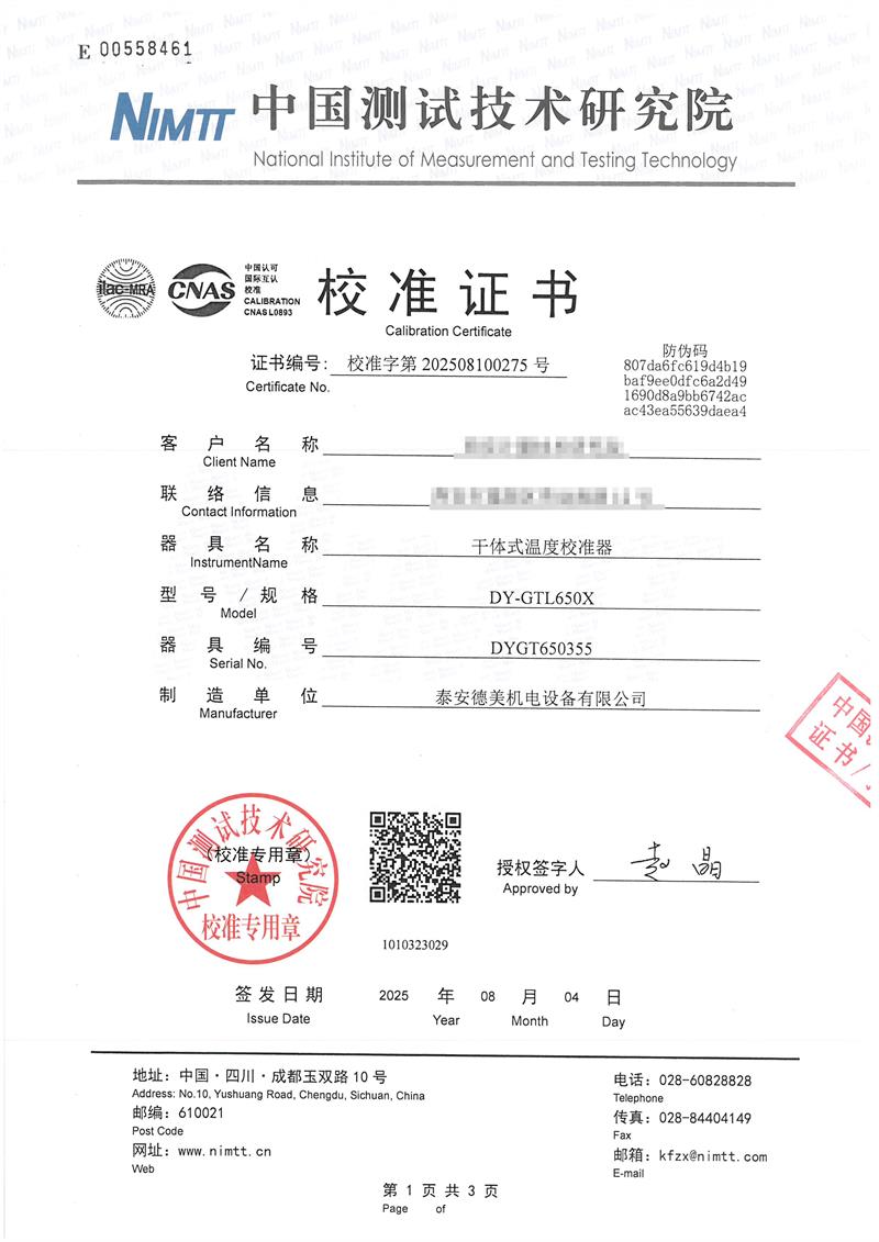 干體式溫度校準(zhǔn)器(40~650℃)校準(zhǔn)證書 2025-8-6 本文被閱讀 1732 次