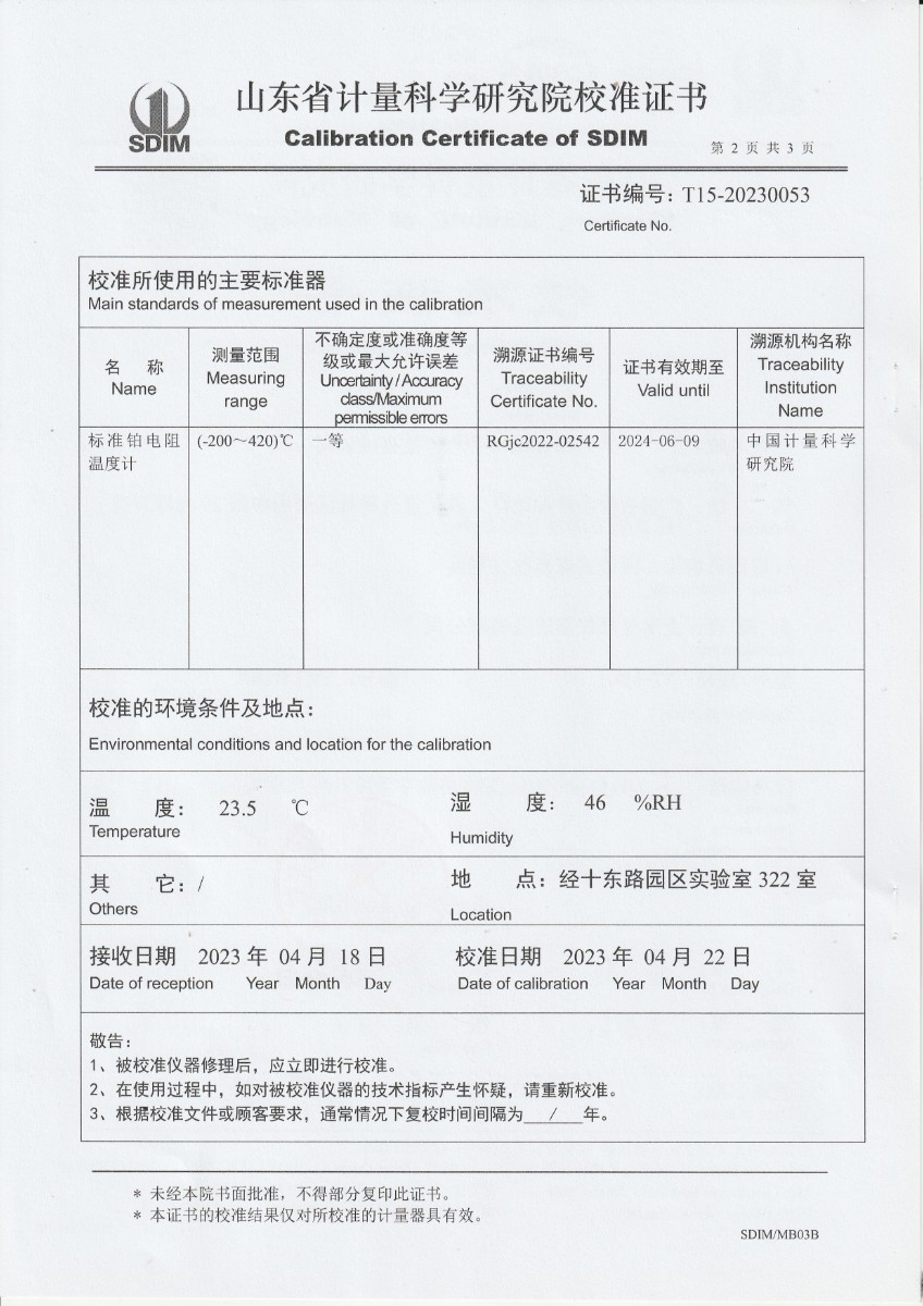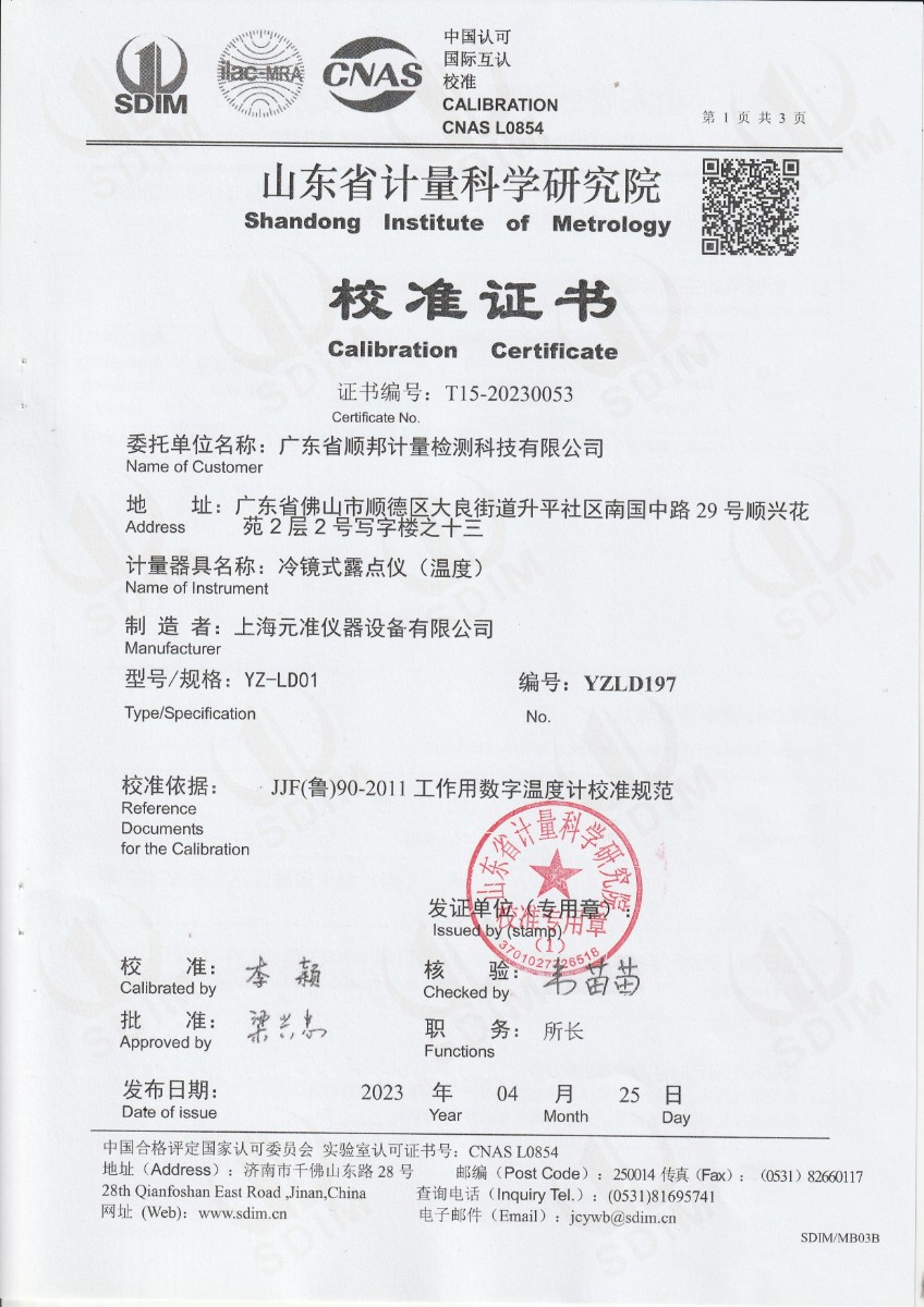 | 上一條:廣東省順邦計量檢測科技有限公司 冷鏡式露點儀 檢定證書 | 下一條:便攜式干體爐(-30-150℃)校準(zhǔn)證書 |