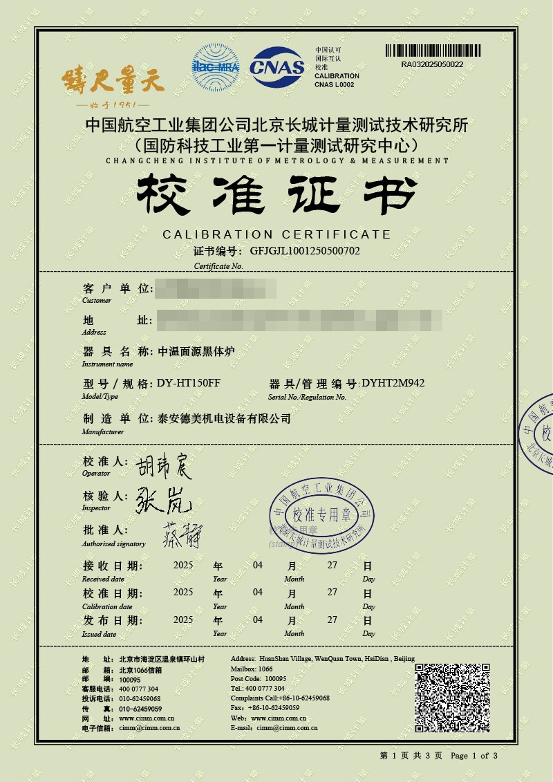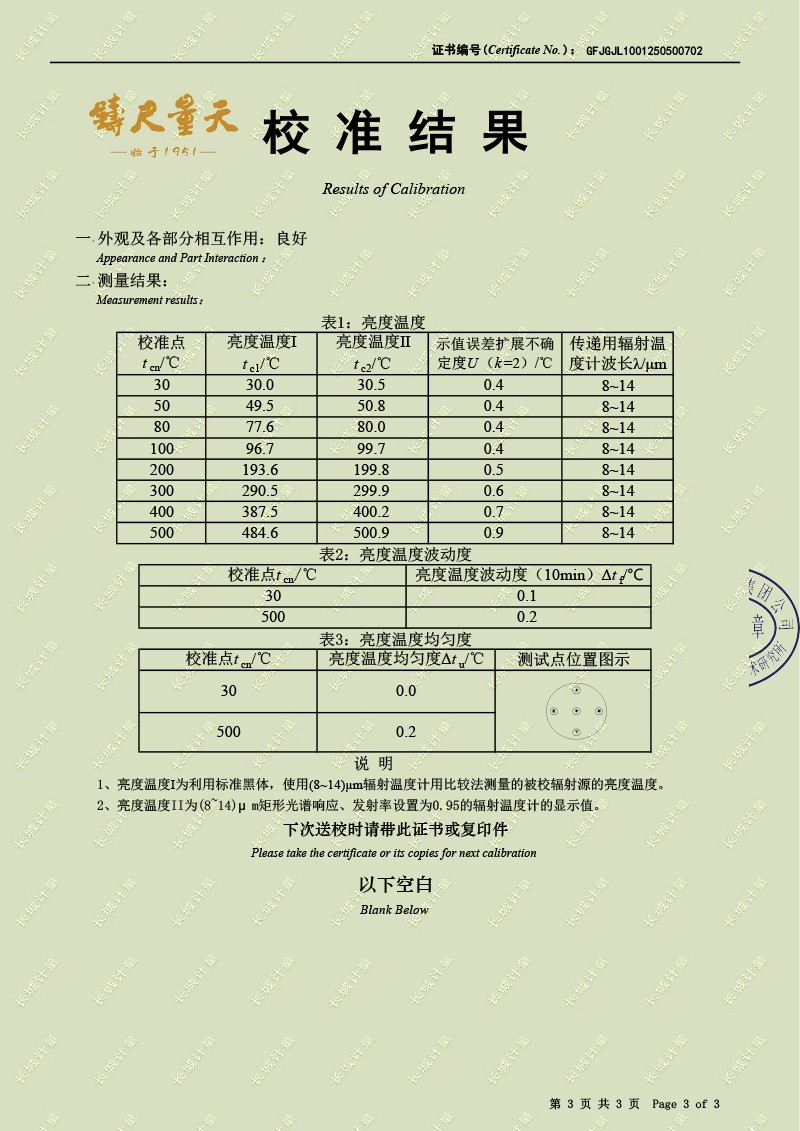 | 上一條:腔式黑體輻射源(-50-100℃)校準(zhǔn)證書(shū) | 下一條:便攜式干體爐(-30-150℃)校準(zhǔn)證書(shū) |