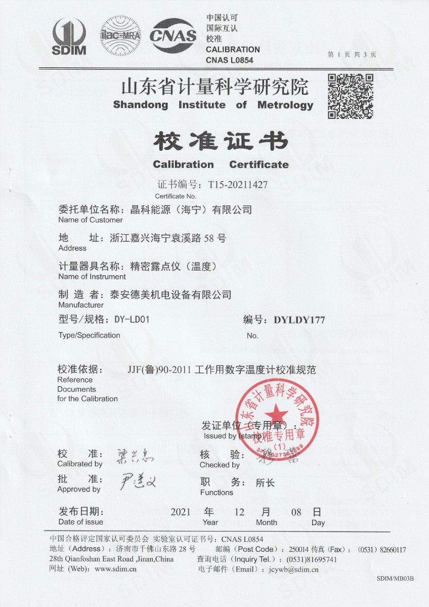 | 上一條:晶科能源(海寧)有限公司-精密露點儀(濕度) | 下一條:便攜式溫濕度檢定箱(-10-60℃)校準(zhǔn)證書 |