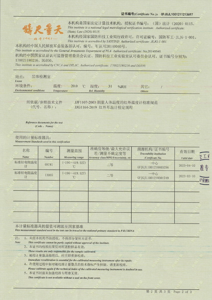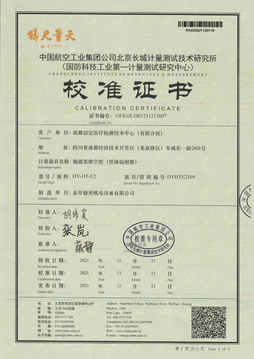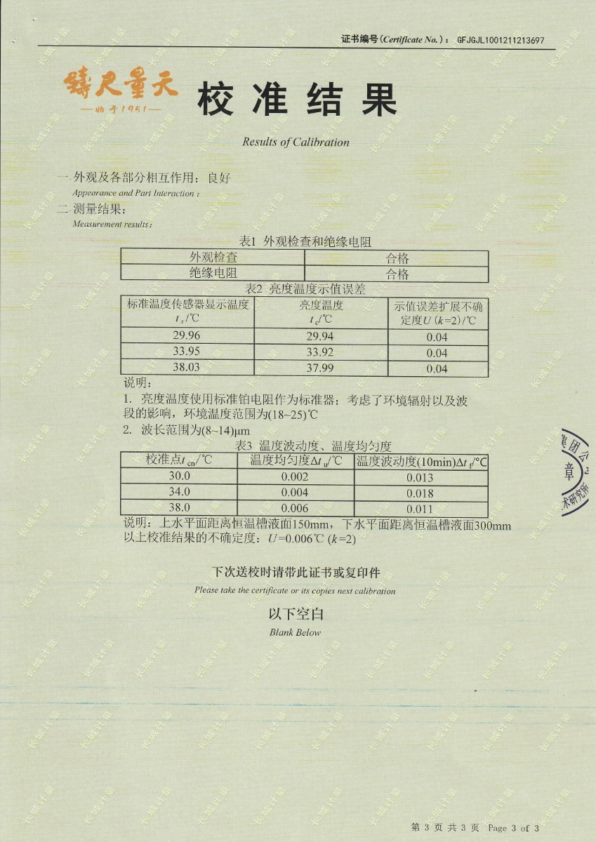 | 上一條:安徽晶科能源有限公司-黑體輻射源 | 下一條:便攜式溫濕度檢定箱(-10-60℃)校準(zhǔn)證書 |