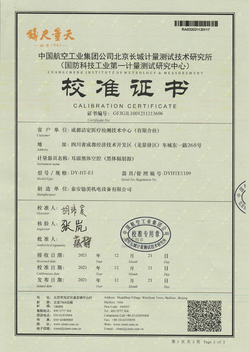 | 上一條:成都潔定醫(yī)療檢測(cè)技術(shù)-額溫黑體空腔 | 下一條:便攜式溫濕度檢定箱(-10-60℃)校準(zhǔn)證書(shū) |
