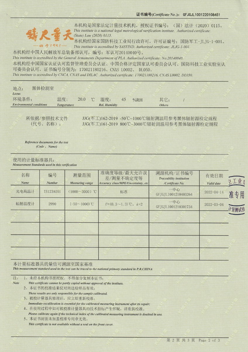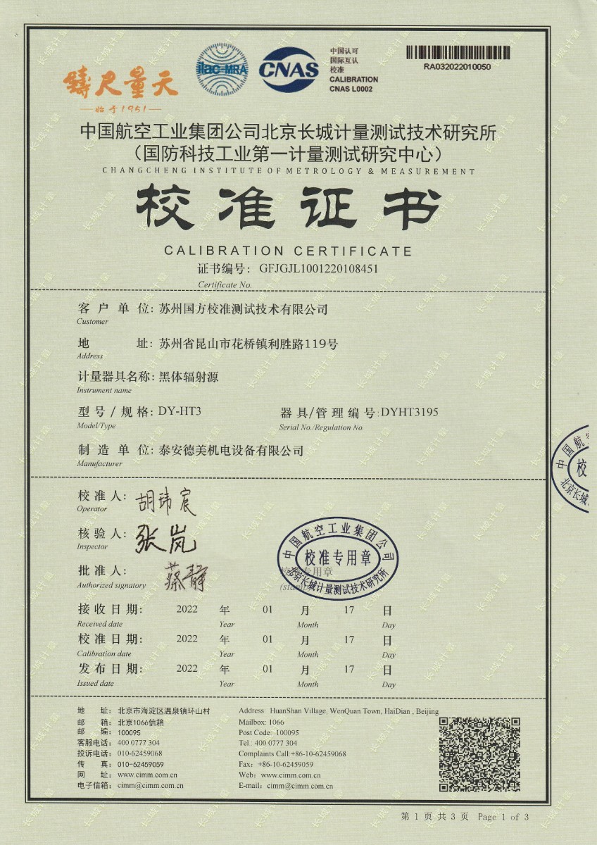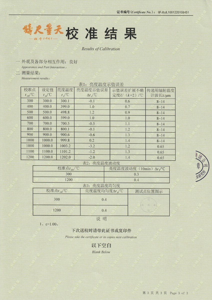上一條:青島加侖檢測(cè)技術(shù)服務(wù)有限公司-黑體輻射源 | 下一條:超低溫面源黑體爐(-40-80℃)校準(zhǔn)證書 |